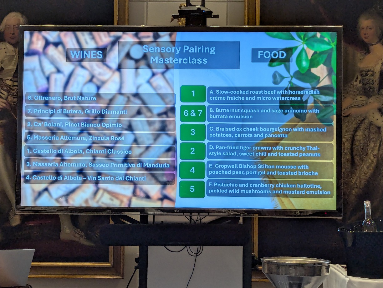 The masterclass, titled an ‘Interactive Tasting Experience’, was run by the UK Sommelier Association and led by Federica Zanghirella, its Vice President. It offered a fresh and engaging approach by pairing a range of Italian wines with a carefully selected menu of dishes. Across the session, we explored seven wines alongside six beautifully created plates, with each wine introduced and explained in depth as we tasted.